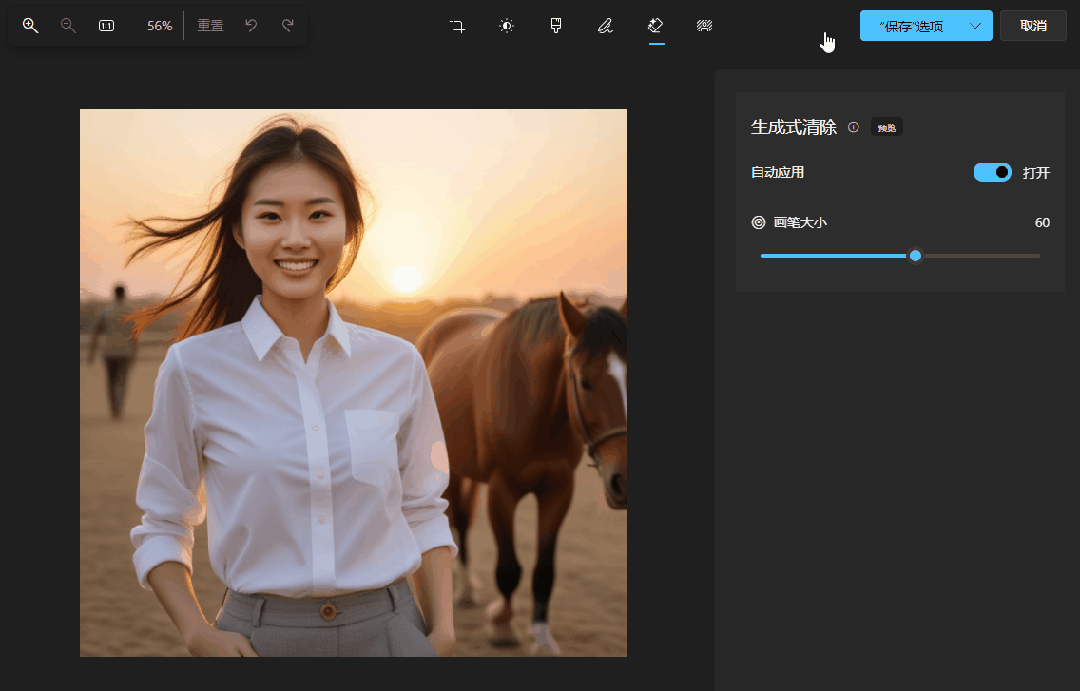 这张图片中,背景有一个路人,可以一键擦除。画笔虽然覆盖了头发,但擦除后头发还是留了下来。